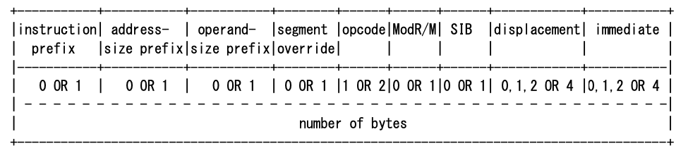 - 译码。根据 instr 中的 opcode 查表获取指令类型和长度,并且根据需要解析 ModR/M , SIB , displacement 码。此时已经知晓的信息是{ 操作类型,操作数寻址方式,地址(如果有),立即数(如果有),该条指令长度}